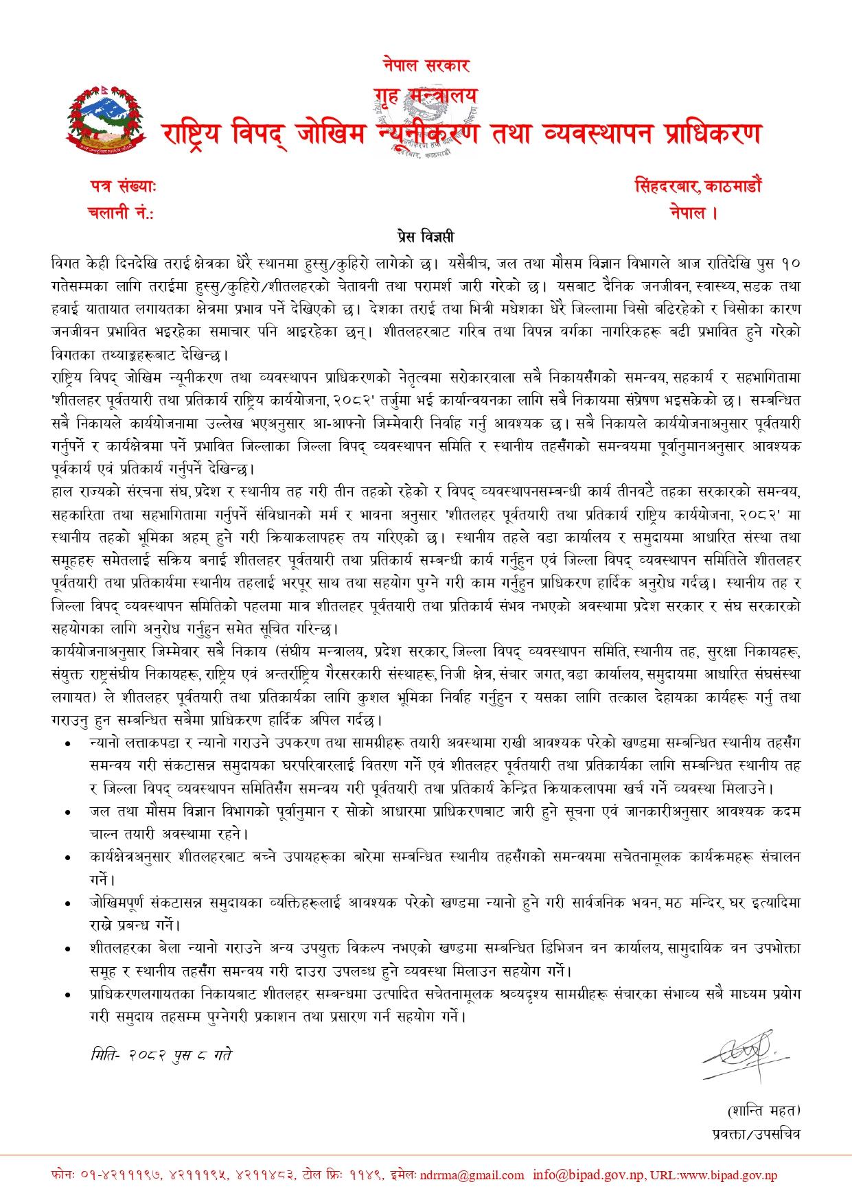 जिम्मेवार सबै निकायले शितलहर पूर्वतयारी तथा प्रतिकार्यका लागि यसै प्रेस विज्ञप्ती बमोजिम गर्नु/गराउनुहुन अनुरोध छ ।